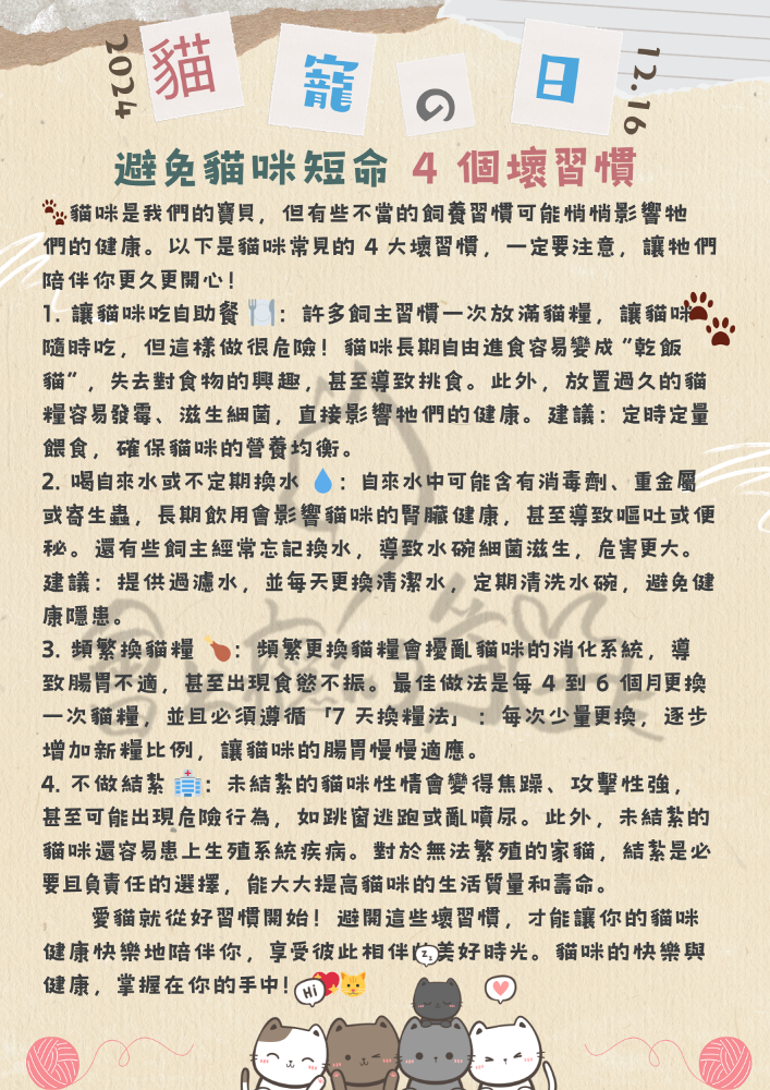 貓咪是我們的寶貝,但有些不當的飼養習慣可能悄悄影響牠們的健康。以下是貓咪常見的 4 大壞習慣,一定要注意,讓牠們陪伴你更久更開心!