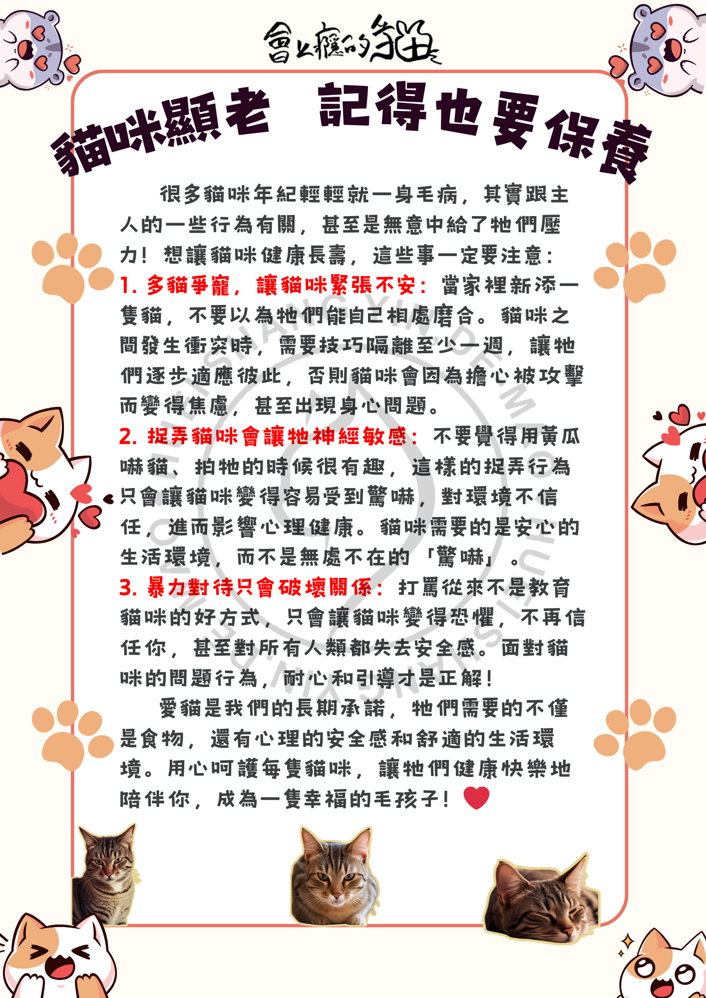 愛貓是我們的長期承諾,牠們需要的不僅是食物,還有心理的安全感和舒適的生活環境。用心呵護每隻貓咪,讓牠們健康快樂地陪伴你,成為一隻幸福的毛孩子!