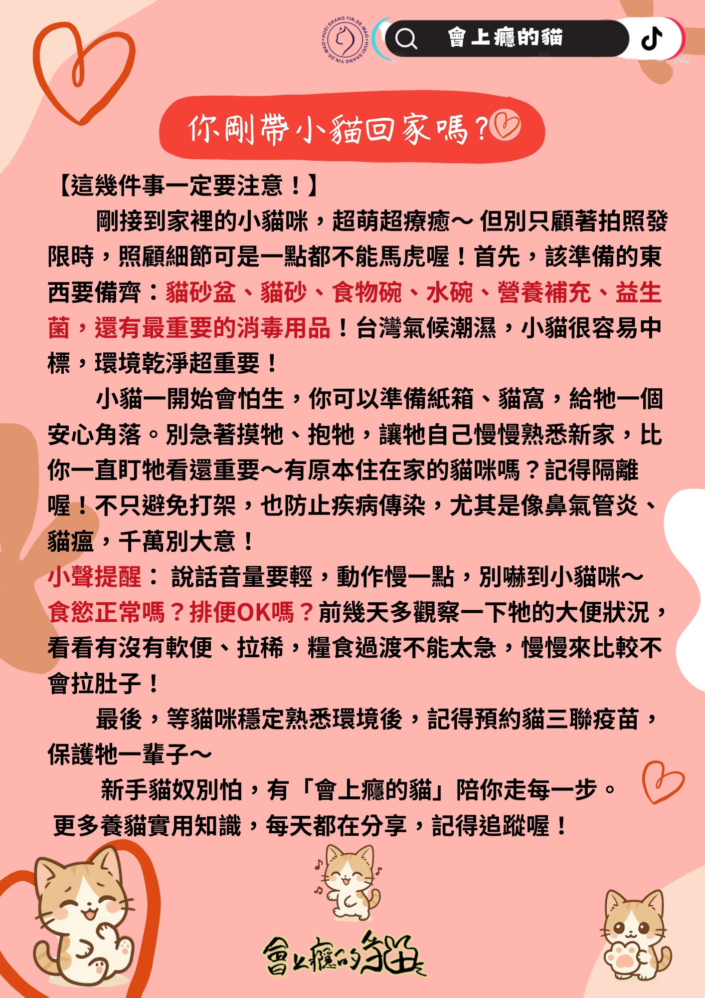 剛接到家裡的小貓咪,超萌超療癒~ 但別只顧著拍照發限時,照顧細節可是一點都不能馬虎喔!首先,該準備的東西要備齊:貓砂盆、貓砂、食物碗、水碗、營養補充、益生菌,還有最重要的消毒用品!台灣氣候潮濕,小貓很容易中標,環境乾淨超重要!